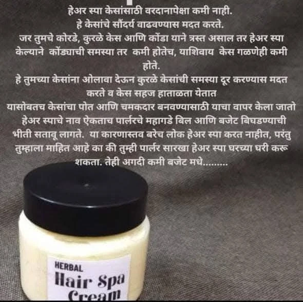 Hair Spa Cream – Intensive Nourishment for Healthy, Shiny Hair Our Hair Spa Cream is specially formulated to deeply nourish, repair, and rejuvenate dull, dry, and damaged hair. Enriched with natural oils, proteins, and essential vitamins, it penetrates each strand to restore softness, strength, and shine.