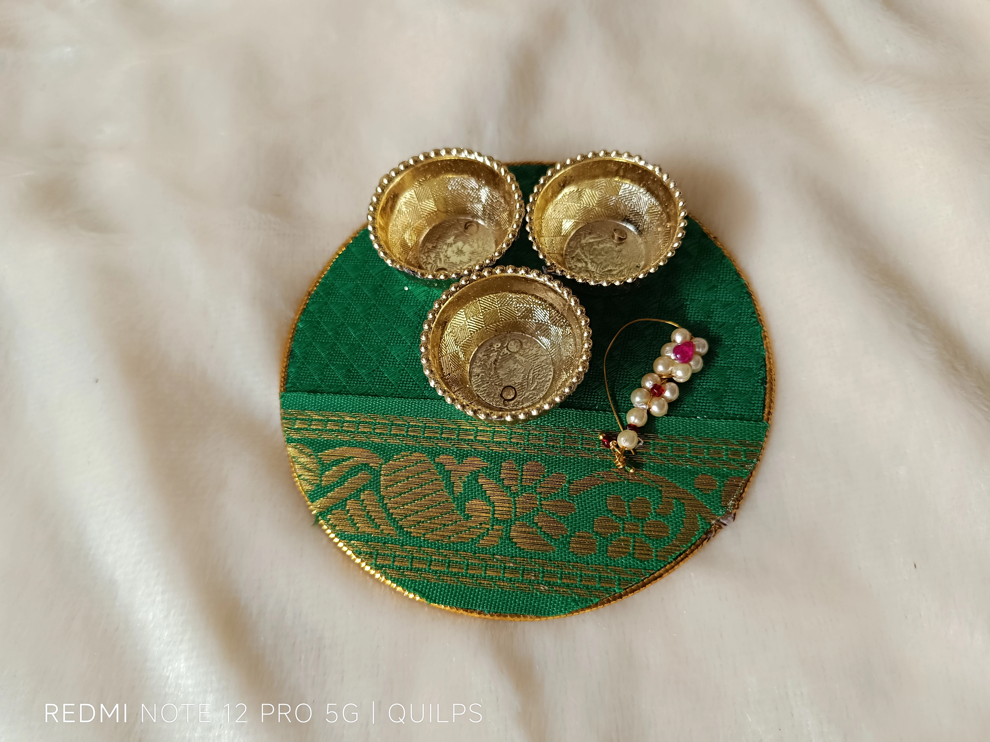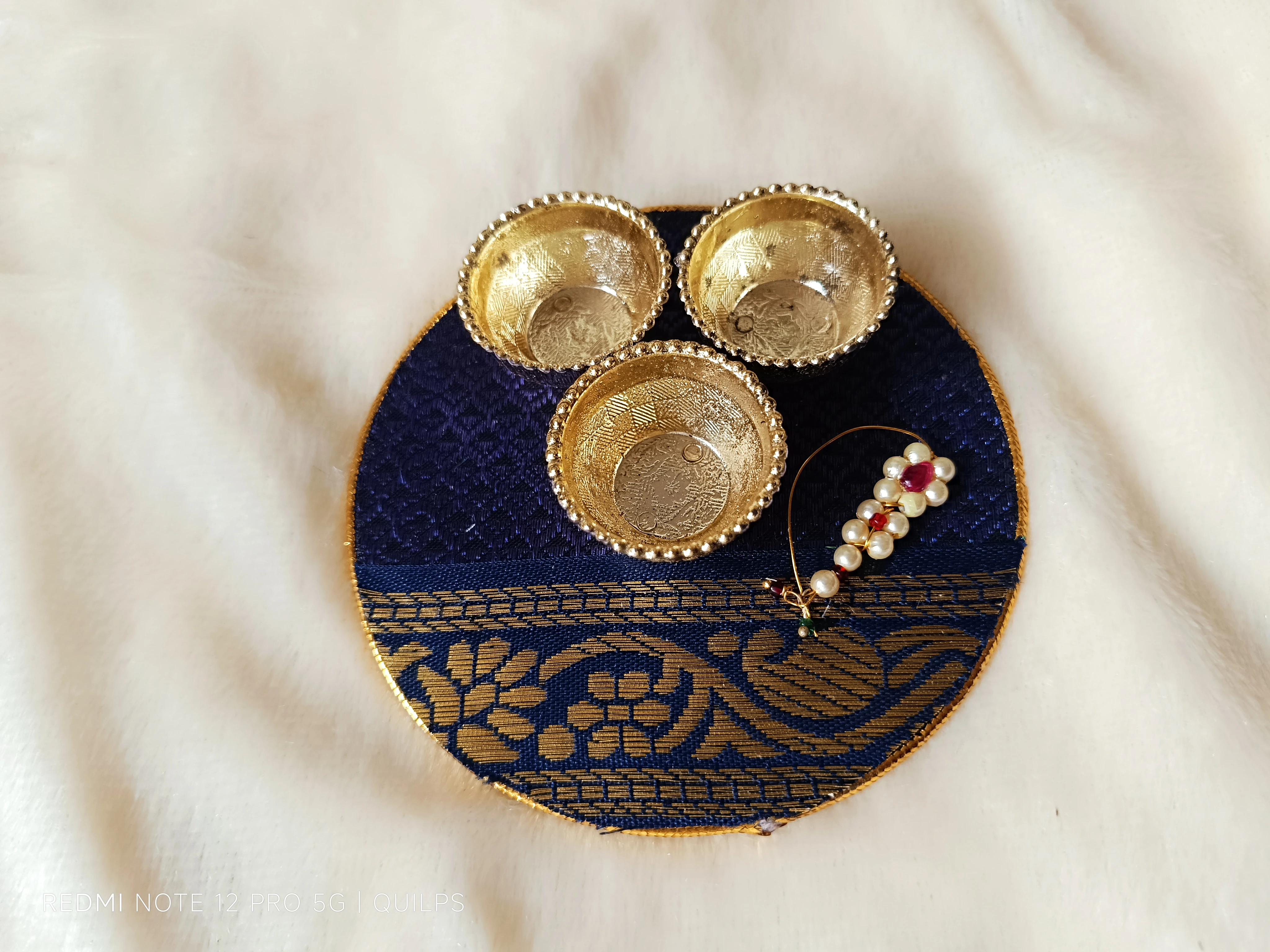This beautiful handcrafted platter features vibrant traditional fabric with intricate gold patterns, adorned with three small gold-colored bowls. Perfect for auspicious occasions and Haldi Kumkum ceremonies