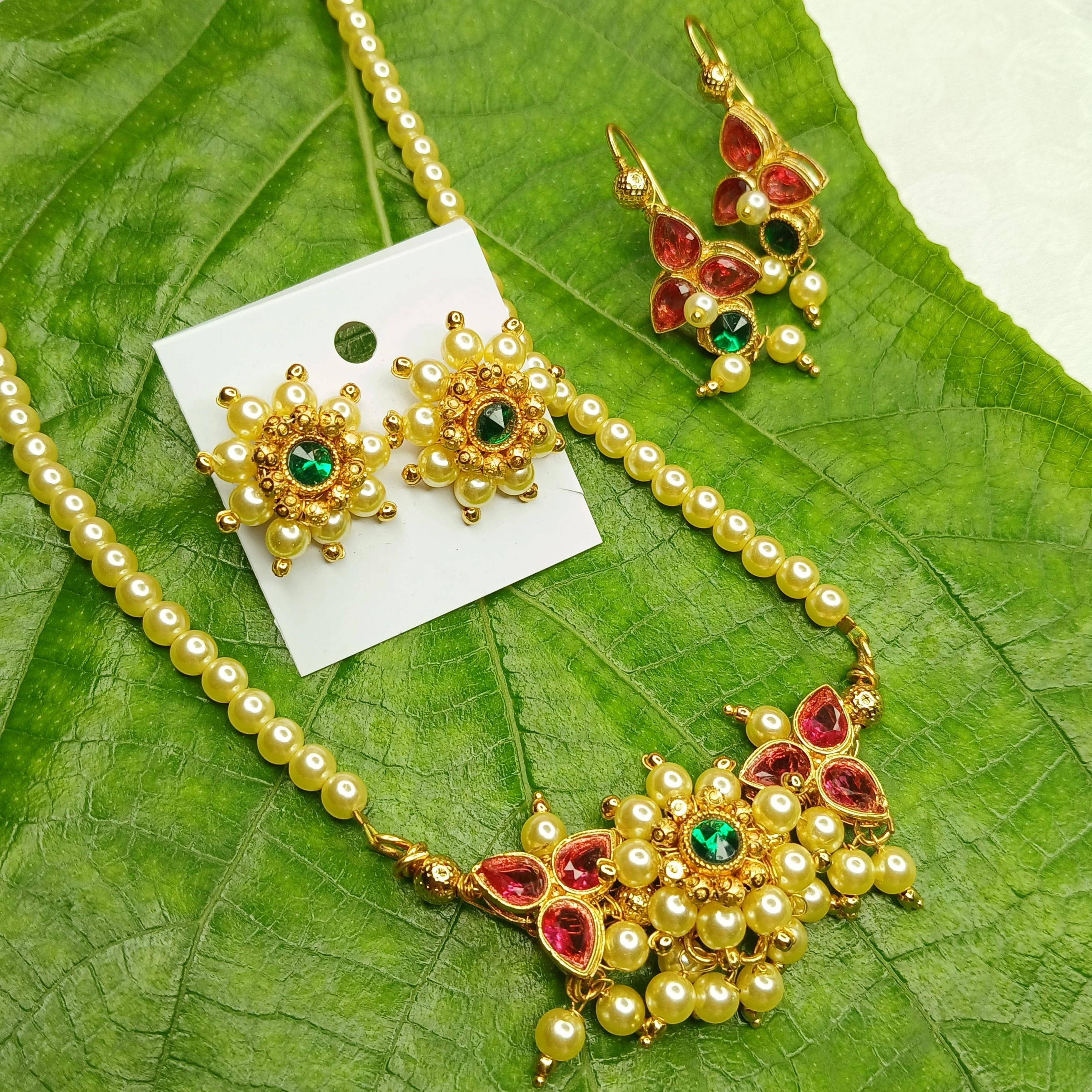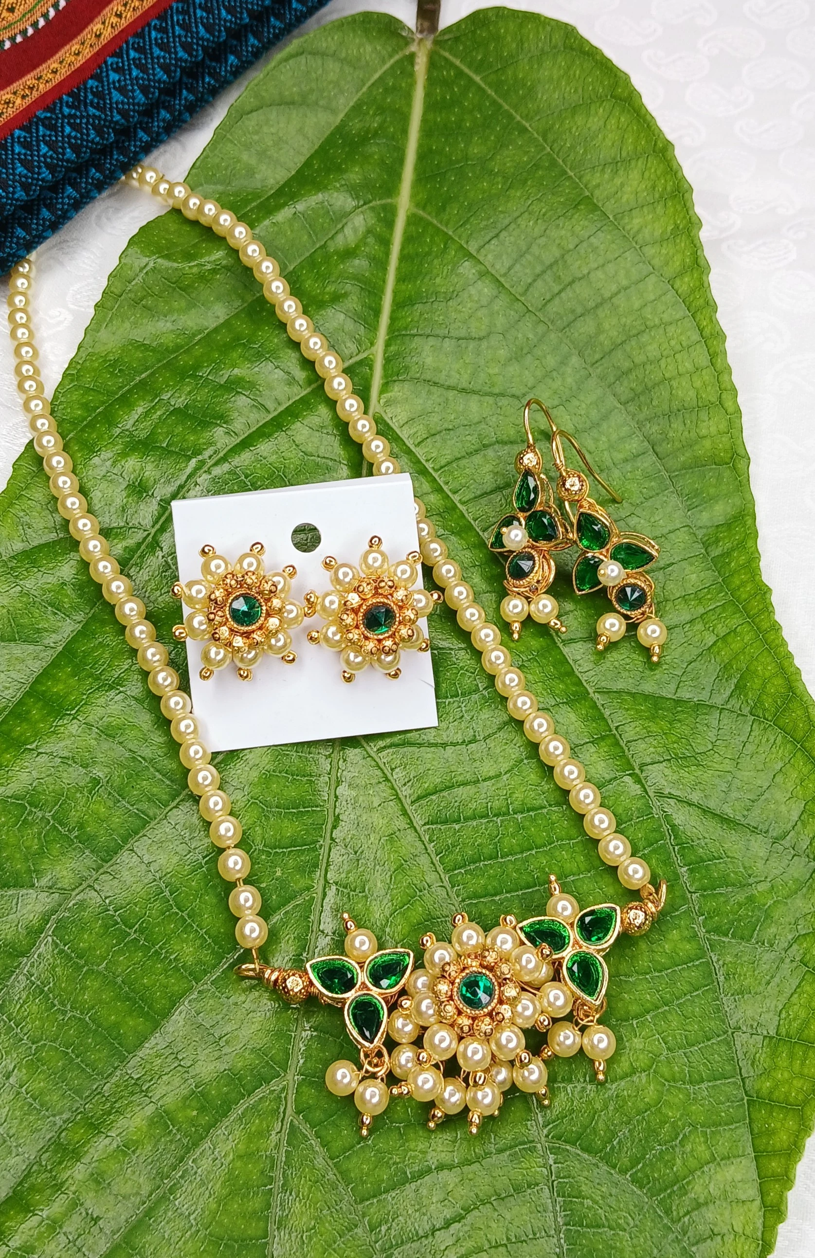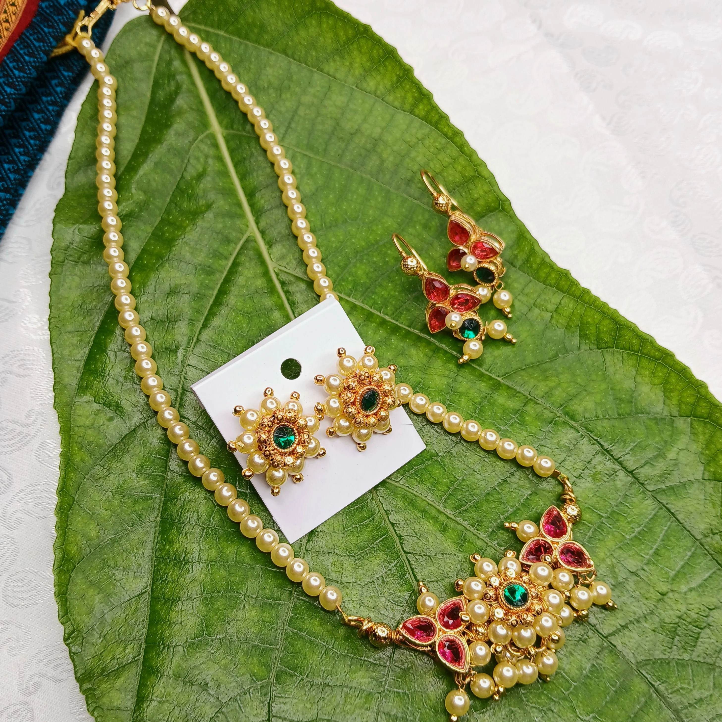 ✨ Moti Tanmani – Traditional Maharashtrian Pearl Necklace with Peacock & Pomegranate Glow Stones with Earrings