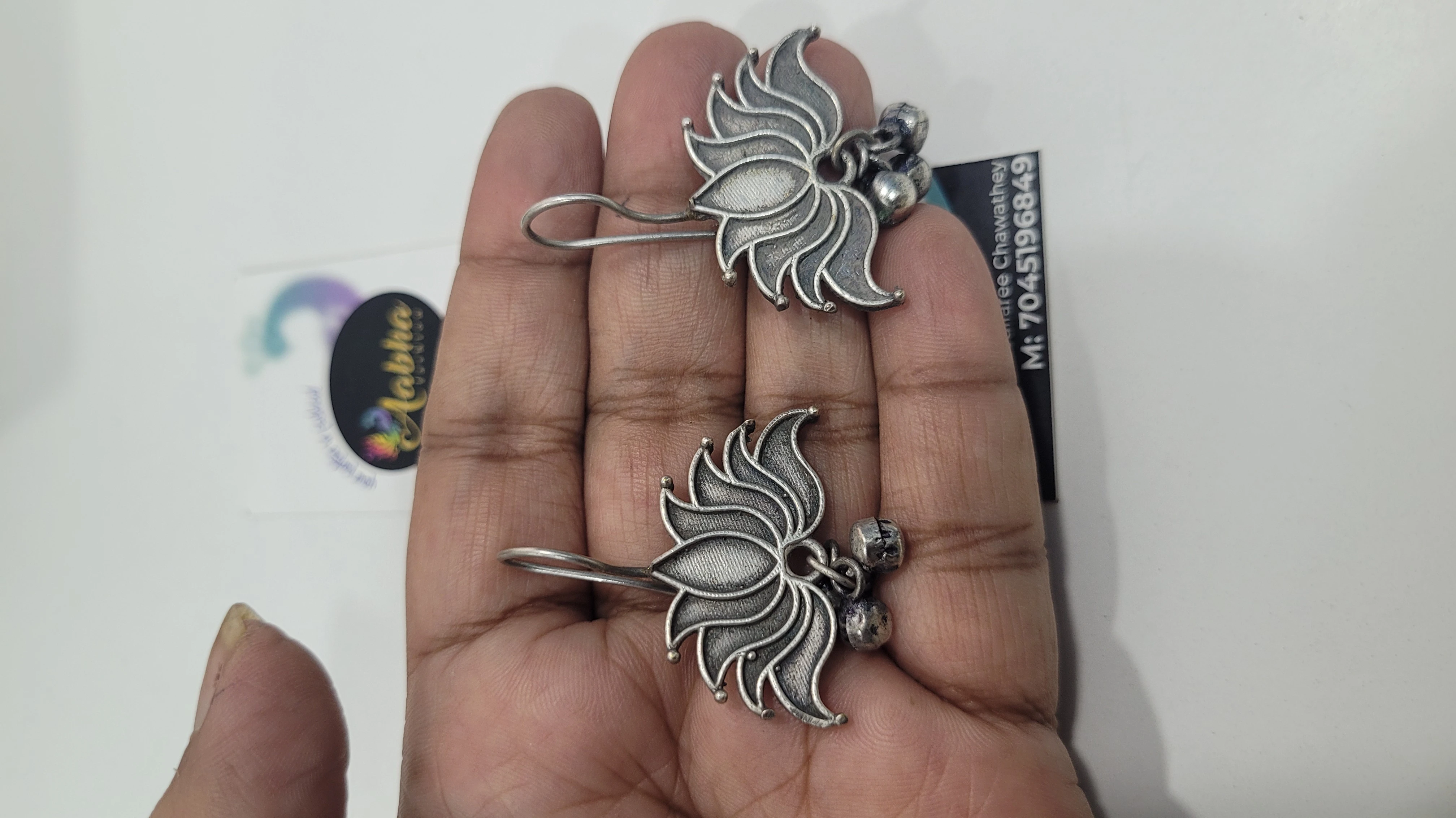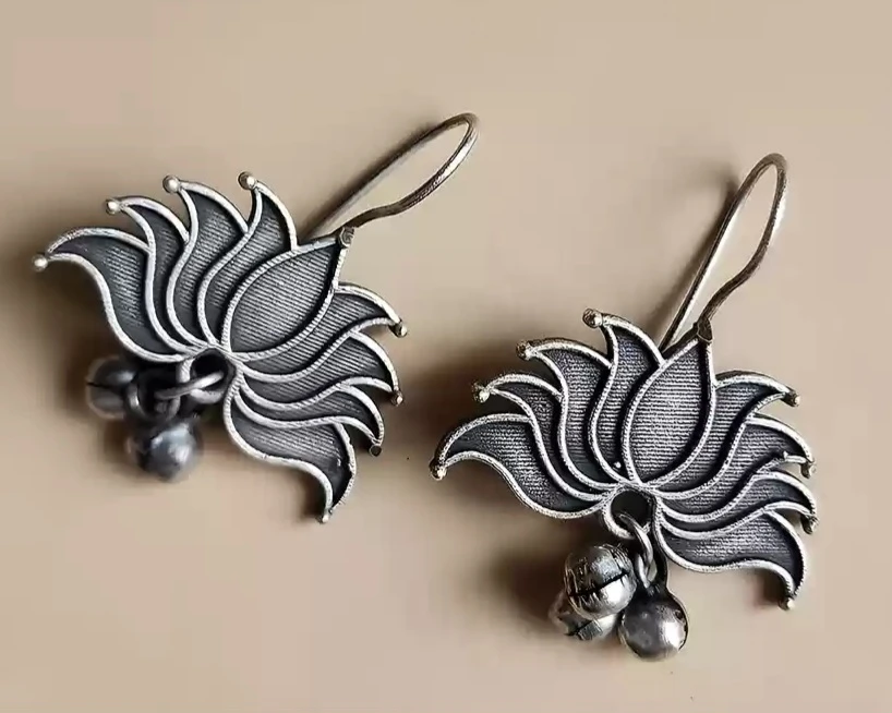 Add a touch of elegance to your look with these Oxidized Hanging Lotus Earrings – beautifully crafted with a silver oxidized finish and a delicate lotus motif.