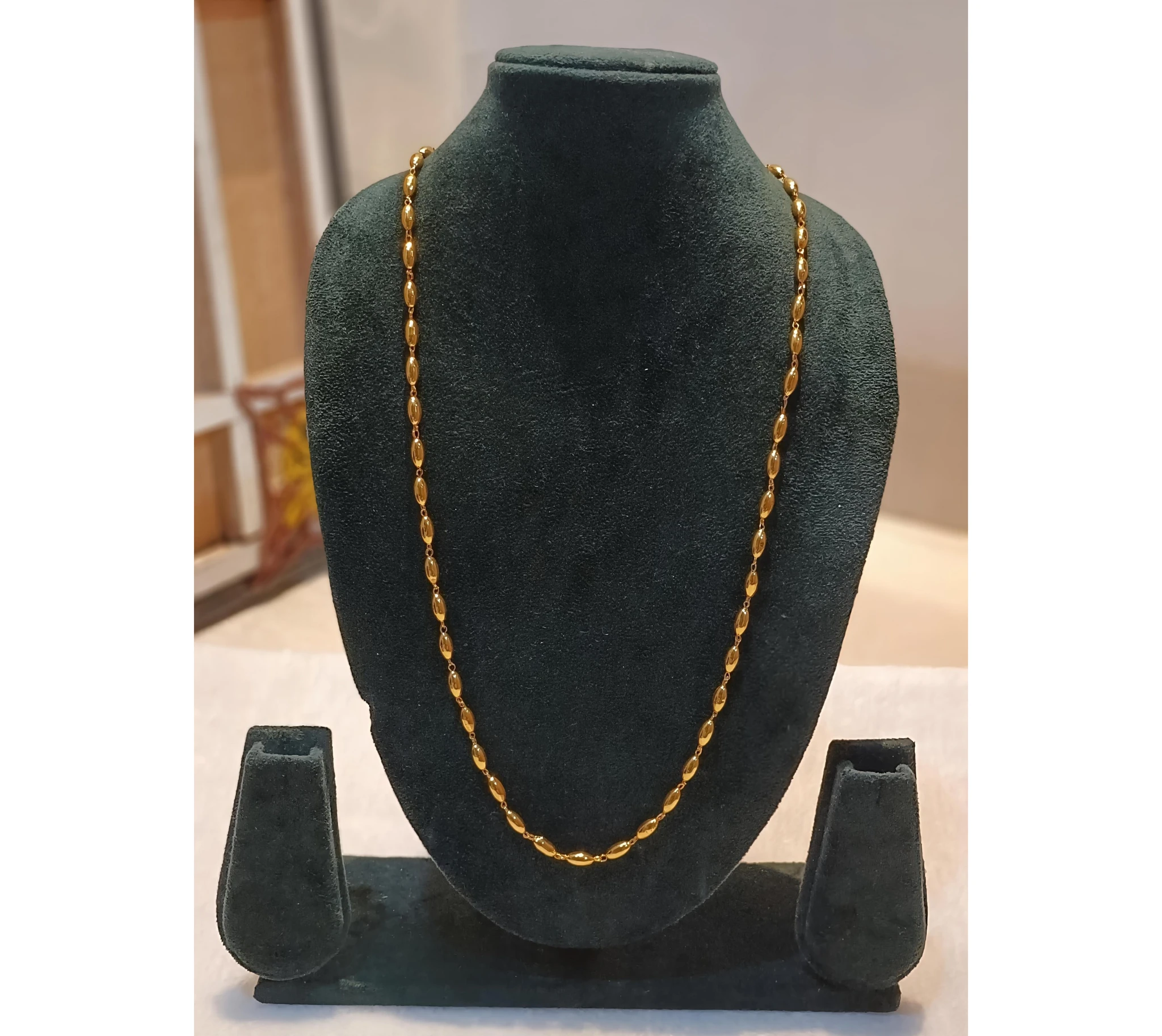 Bring elegance and tradition together with this Small Single Layer Gahumala, crafted with fine detailing in a micro gold finish. This beautiful necklace features traditional wheat-grain (gahu) shaped beads, offering a timeless and graceful ethnic look. Each Gahumala is traditionally prepared, lightweight, and perfect for daily use, pooja rituals, or festive occasions. Its minimal yet classy design makes it an ideal choice for women of all ages who appreciate subtle ethnic jewelry.